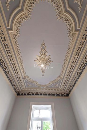 A thoughtfully restored facade and interiors that retain the elegance of its original design, featuring handmade paintings, intricate mouldings, antique fixtures, and opulent finishes.