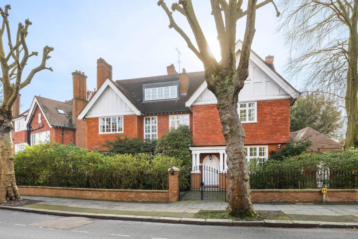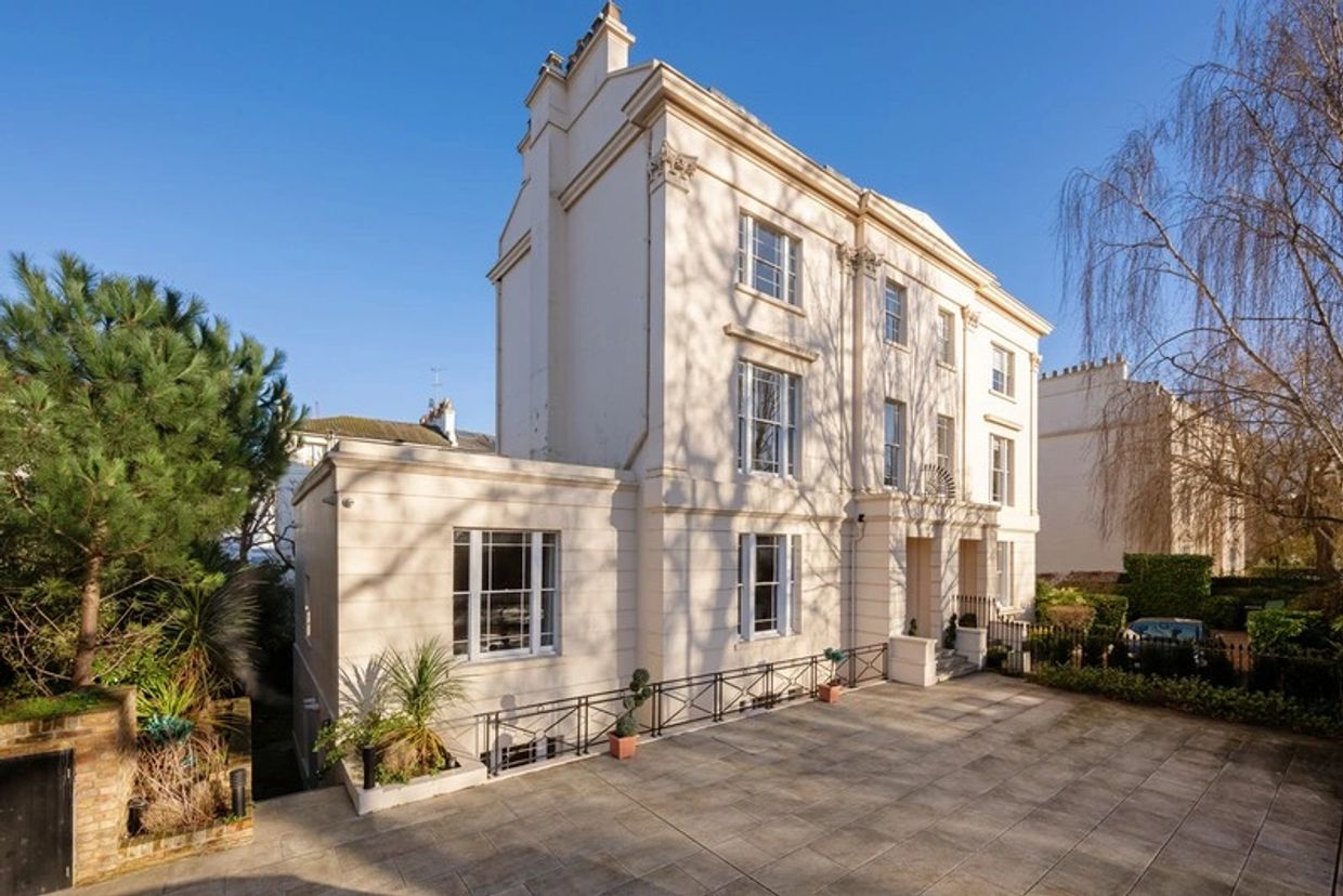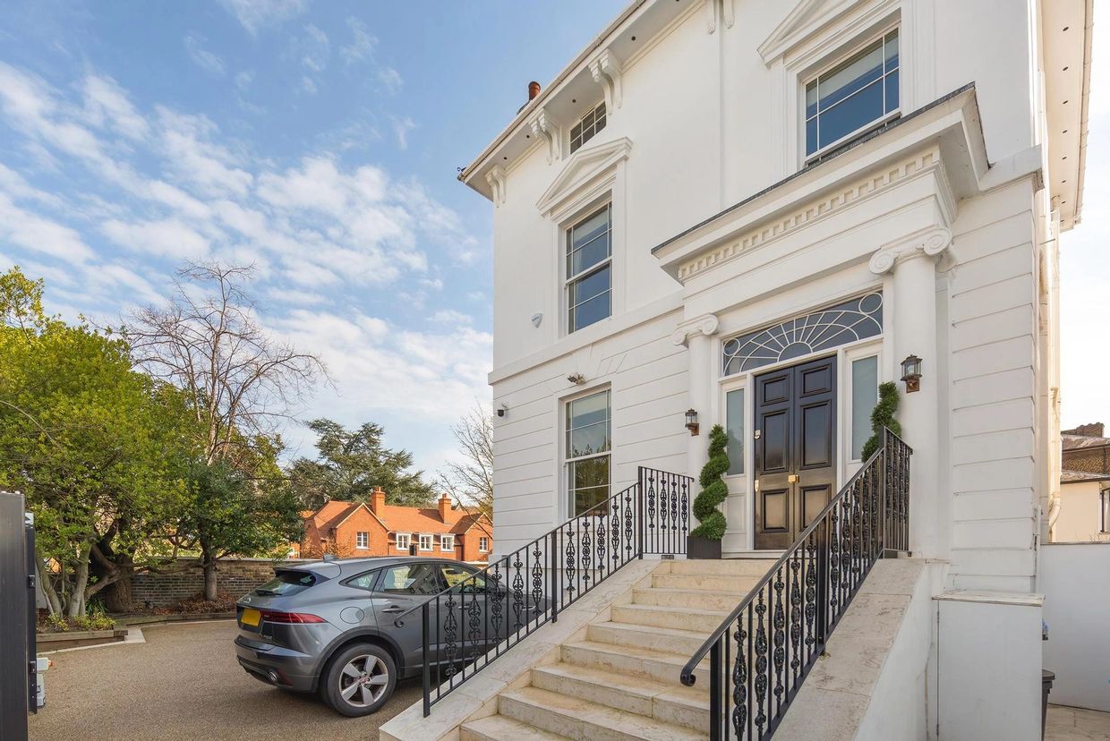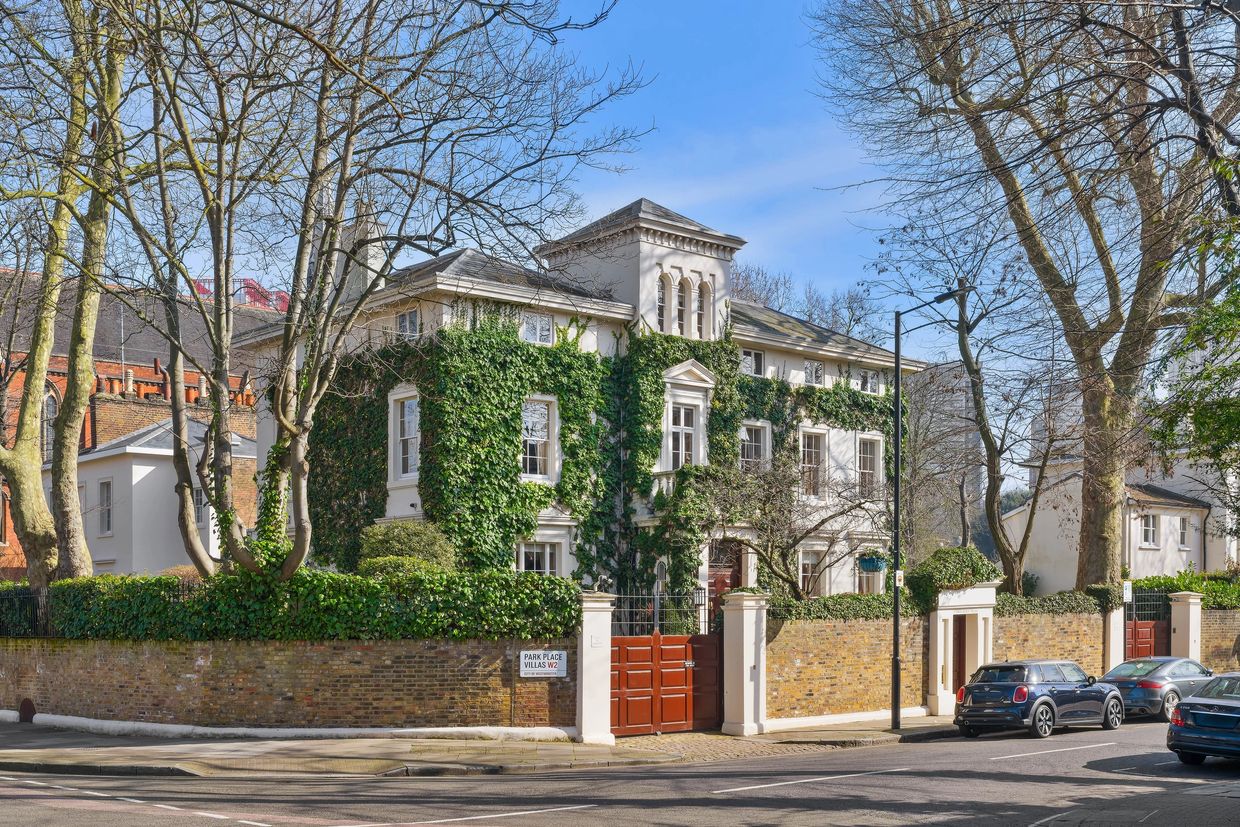 The villa sits on a 0.255-acre corner plot, set back from the road and approached through twin gates, with a pedestrian entrance. The property overlooks Regent's Canal and includes a secluded wraparound garden, a large carriage drive, additional secure off-street parking, and an integral double garage. The property also boasts a mature wraparound garden with two separate areas, one featuring Lillie Langtry's famous love-seat and the other a rear terrace leading to the principal lawned garden.